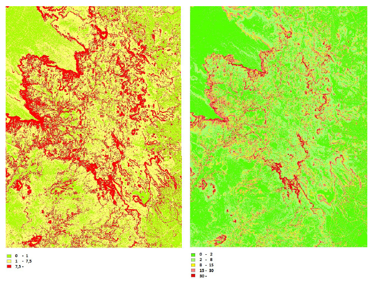 En esta zona de estudio, se han considerado dos clasificaciones para la pendiente. Cuando Dichas clasificaciones se aplican al modelo PTE02 dan lugar a los valores “patrón” que serán los consideraremos como valores fijos en el contraste (2) y que el producto PTE05 debe cumplir. En la Tabla 7 y la Tabla 8 se resumen dichos porcentajes, cuya representación espacial se muestran en la Figura 2.