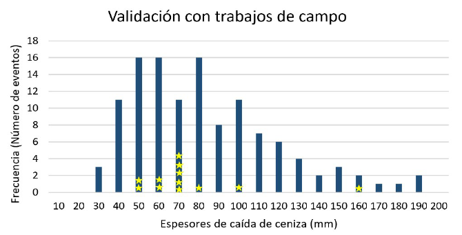 Figura 2 Histograma de frecuencia de caída de ceniza de simulaciones (barras azules) comparado con el espesor de las 12 capas de ceniza y lapilli identificadas en la turbera de Cayambe (estrellas amarillas).