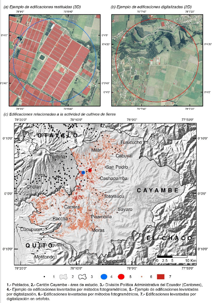 Utilizando la ortofotografía del Instituto Geográfico Militar (IGM) (2012b), foto identificación y verificación en campo, se digitalizaron las edificaciones relacionadas a la actividad de cultivos de flores en la zona de estudio (Tabla 2). Los datos digitalizados fueron unificados con los archivos levantados por el IGM por restitución fotogramétrica (Figura 5), dando un total de 17 916 y 21 090 edificaciones de tipo punto (menores a 6 m2) y polígono (mayores a 6 m2) respectivamente. Para el estudio no se ha considerado técnicas alternativas como la generación de ortoimágenes a partir de drones o imágenes de satelitales de alta resolución para la captura de las edificaciones por métodos fotogramétricos o digitalización por los costos que implicaría el procesamiento de la información a la escala requerida tomando en cuenta la superficie. Superficies menores a 35 ha haría viable esta técnica considerando los costos de generación del insumo que bordea los USD 3 000 (Granados-Bolaños et al., 2021).
