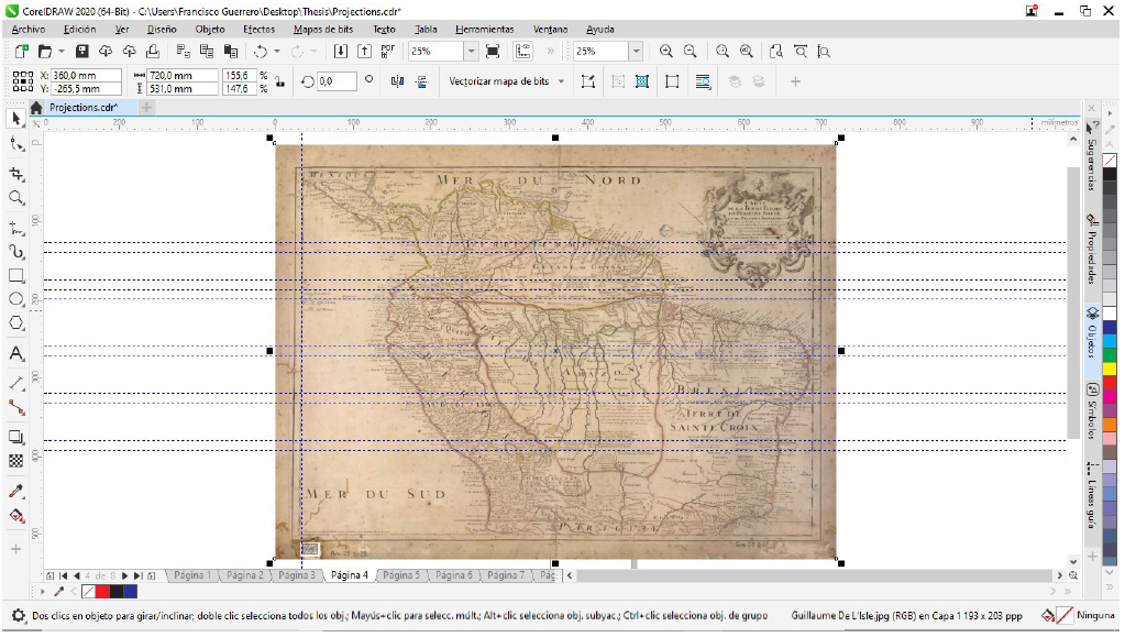 Using CorelDRAW, the images were resized based on the data obtained from consultations with online libraries that have an original or a copy of the maps in their collection (Table 2). Then, the distance between two consecutive parallels was calculated in order to establish the measurement of a degree of latitude and to compare this with the real distance on the ground. In order not to depend on a single measurement, between four or six measurements were made to have a greater sample of data and determine a more accurate result (Table 3, 4, 5, 6, 7). Scales are expressed by its denominator.