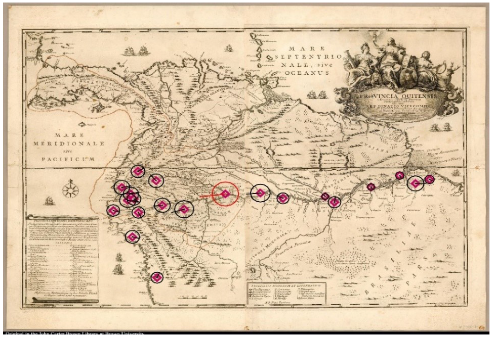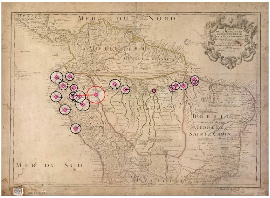 Clearly, these events increased the growing interest of the colonizers, giving rise to more explorations and their subsequent written and cartographic documentation. In addition, the separation between the Spanish and Portuguese crown in 1640 and its subsequent armed conflict, generated greater support for the actions of presence in the Amazon River and its tributaries. One of the main colonial agents were the religious orders, especially the Jesuits who are considered among the first explorers of the region, establishing the so-called ‘missions’ that facilitated the expansion of the borders and conversion of the indigenous population to Christianity (Barcelos, 2006).