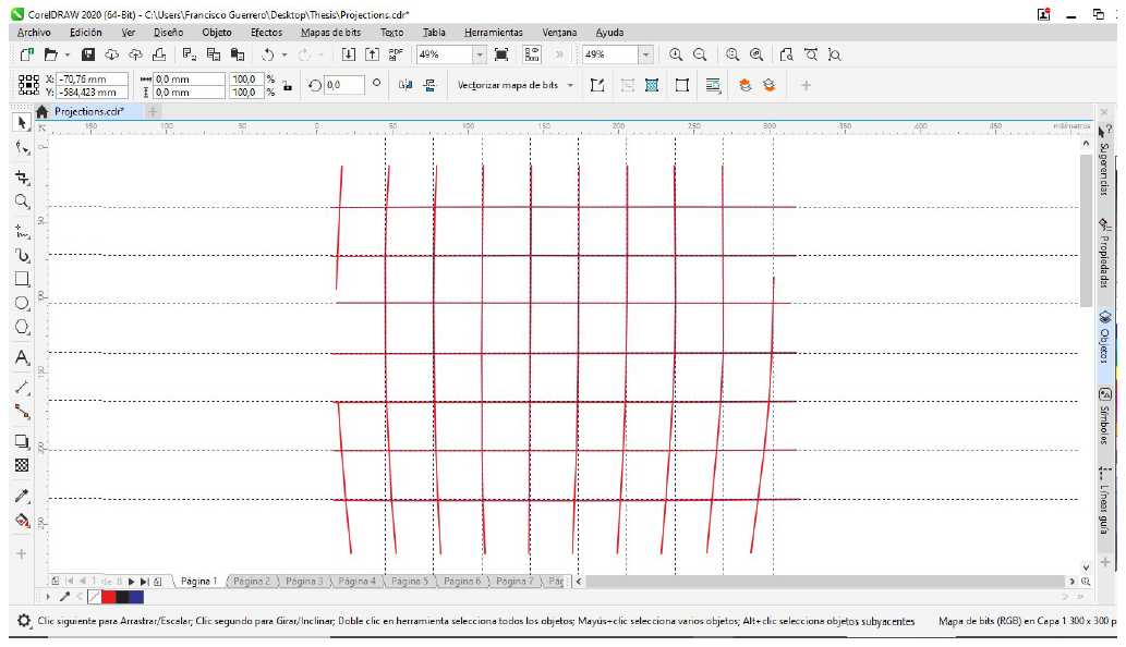 Using CorelDRAW, the grid drawn on each map was delineated for a better visualization of its shape and the angles formed between meridians and parallels. Then, the distances between each of the meridians and parallels were calculated, taking the left and upper sides of the map as a reference (Table 13, 14, 15). The origin of the measurements for the parallels is the equatorial line, for which positive positions are calculated for northern latitudes and negative positions for southern latitudes; in the case of meridians, the origin of the measurements is a random meridian from which the positions to its left are negative and to its right are positive. For a better visualization of the process, a screenshot of how A_GI map grid looks like is included (Figure 3).