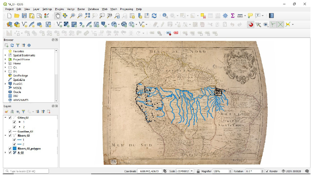 With the georeferenced images, the digitalization of the main features such as cities, rivers and coastlines began using the QGIS Desktop.11 Later, the Project Coordinate Reference System (CRS) was defined based on the parameters described in Table 17 and a GeoPackage (.gpkg) file was created to store the digitalized shapefiles.