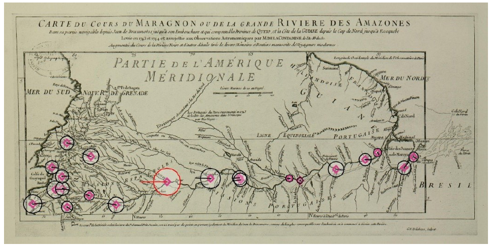 Finally, the presentation of the results was in 1745 including a map based on his observations. La Condamine was the person that took the measurements and the French geographer Jean-Baptiste Bourguignon d’Anville was the responsible to draw it (Cintra, 2011). The map includes the Pacific and Atlantic coast, it extended from the Spanish province of Quito in the west to the Portuguese city of Grão Pará (Belém) in the east, including the Guyanas to the north and parts of Brazil and Peru to the south.