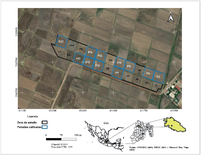 Se realizó el monitoreo del ciclo agrícola 2022 de 5.5 hectáreas de cultivo de maíz en el Ejido de San Francisco Chalchihuapan que pertenece al municipio de Atlacomulco, Estado de México (19° 45’ 58 N y 99° 52’ 32 O). Esta área cubre 22 parcelas de riego rodado de ¼ de hectárea (Figura 1). No obstante, solo 11 parcelas fueron sembradas en este ciclo. Fueron sembradas con maíz criollo entre el 28 de marzo y el 1 de abril de 2022. El clima en Atlacomulco es subhúmedo con lluvias en verano (CW), precipitación media anual entre 800 y 1000 mm y rangos de temperatura de 6° C-20° C. La temporada de lluvias comienza en mayo y finaliza en octubre, mientras que la estación seca, de noviembre a mayo.