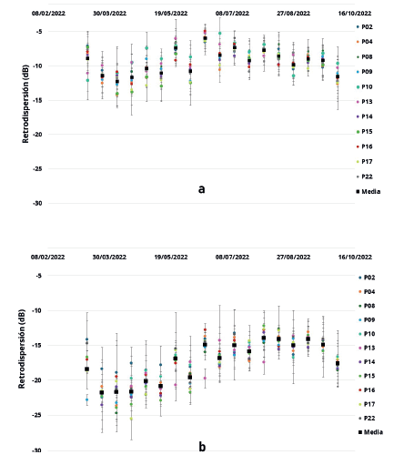 Figura 10 Retrodispersión multitemporal de los valores de las polarizaciones a) VV y b) VH.
