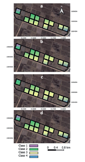 Finalmente, con relación a los resultados de la segmentación de fusión de regiones genéricas de los IVs calculados a partir de las imágenes del VANT, se observan las regiones del área de estudio que presentan características similares (Figura 11). Se logró determinar que la clase 2 representa los valores más altos de los IVs. Además, se puede observar que el comportamiento de las regiones es similar en el tiempo.