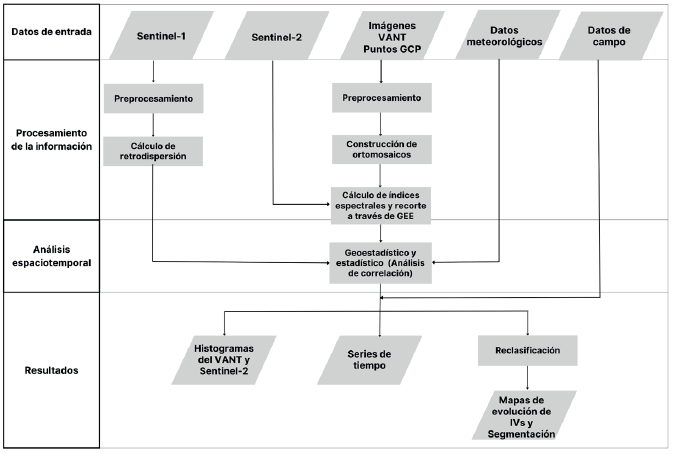 El diseño metodológico (Figura 2) se basó en los estudios a nivel internacional de Zhang et al. (2022), Jorge, Vallbéa y Solerb (2019) y Nonni et al. (2018) para la selección de los IVs que se analizaron en este trabajo. Mientras que a nivel nacional se consideró el estudio en parcelas experimentales de la Universidad Autónoma Chapingo de López-Hernández (2021) relacionado el monitoreo de estrés hídrico en cultivo de maíz mediante imágenes multiespectrales de un VANT. Los IVs seleccionados fueron el Índice de Vegetación de Diferencia Normalizada (NDVI), el Índice Normalizado Diferencial de Borde Rojo (NDRE), el Índice de Vegetación de Diferencia Normalizada Verde (GNDVI), el Índice de Vegetación de Diferencia Normalizada Verde-Rojo (GRNDVI), el Índice de Vegetación de Proporción Verde (GRVI) y el Índice de Vegetación de Rango Dinámico Amplio (WDRVI). Respecto al análisis espaciotemporal de los datos Sentinel-1 la metodología se basó en el estudio de Aobpaet (2022) y Arslan, Topakcı y Demir (2022). Los análisis de correlación se basaron el trabajo de Ma, Johansen y McCabe (2022).