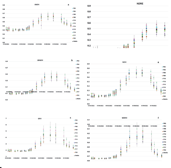 Figura 3 Comportamiento de los seis IVs en la zona de estudio: a) GNDVI, b) GRNDVI, c) GRVI, d) NDRE, e) NDVI y f) WDRVI.