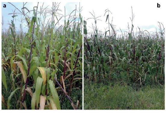 Figura 4 La inspección in situ. (a) parcelas de maíz con hojas amarillas; (b) parcelas de maíz con hojas verdes.