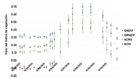 Figura 5 Análisis espaciotemporal del vigor del cultivo de maíz a través del GNDVI, GRNDVI, NDRE, y NDVI.