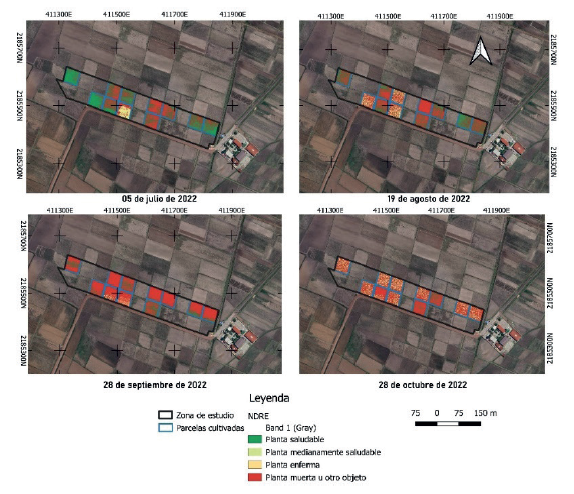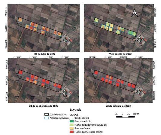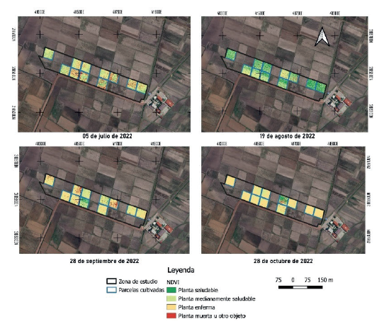 Las capas ráster de los IVs del satélite Sentinel-2, así como la retrodispersión del satélite Sentinel-1 se vectorizaron a través de la herramienta Raster Pixels to Points del programa QGIS versión 3.20.2 para tener un mejor manejo de la información. Posteriormente, se llevó a cabo un análisis espaciotemporal de los seis IVs y la retrodispersión con la finalidad de determinar su sensibilidad a los cambios del verdor de la planta. Por otro lado, se reclasificaron los índices normalizados NDVI, GNDVI, GRNDVI y NDRE calculados con las imágenes del VANT a través de la herramienta Reclasificación por tabla de QGIS considerando 4 clases asociadas a la salud del cultivo a) planta saludable con valores del 1 al 0.6, b) planta medianamente saludable con valores de 0.6 al 0.3, c) planta enferma con valores de 0.3 al 0 y d) planta muerta u otro objeto con valores de 0 a -1.