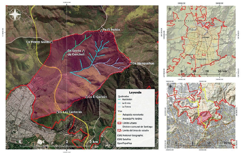 La cuenca de los cerros Manquehue-El Peñón (33° 21’ 04” S-70° 36’ 00” O) es parte de una estribación de la subcuenca del río Mapocho, perteneciente a la cuenca del río Maipo, situándose en el límite norte del Área Metropolitana de Santiago, específicamente al norte de la comuna de Huechuraba (Figura 1). En este trabajo los límites de la cuenca quedaron definidos por la divisoria de aguas trazada por los cerros Cantera, El Carbón, Manquehue, El Peñón, y Monte Gordo, y por el canal El Carmen en su zona baja, el cual capta aguas del canal San Carlos, que las hace confluir en los canales Batuco y Colina al noroeste (Municipalidad de Huechuraba, 2013). La cuenca alcanza una superficie de 946 ha, y su altitud fluctúa entre los 582 msnm en el valle, y los 1.638 msnm en la cumbre del cerro Manquehue. Su red de drenaje está encabezada por las quebradas La Ermita, Huallalolén y La Totora, las cuales se activan con las precipitaciones invernales. El clima en que se inserta el área de estudio es Mediterráneo, con una marcada estacionalidad, caracterizada por precipitaciones invernales que alcanzan promedios anuales de 356 mm, y una temporada estival de aproximadamente siete meses que alcanza en promedio una temperatura máxima de ~30 °C (Dirección Meteorológica de Chile [DMC], 2024).