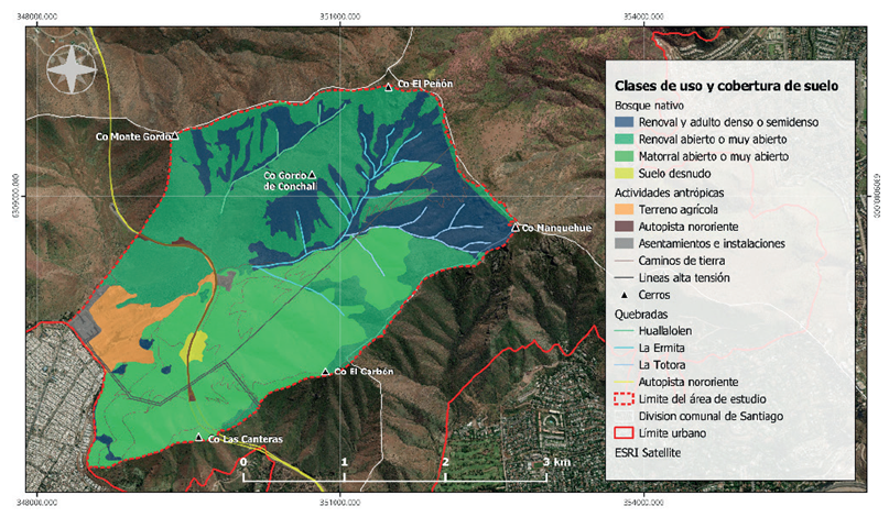 Desde las cumbres de los cerros Manquehue y El Peñón, en la comuna de Huechuraba, se extiende en dirección surponiente la cuenca sur más grande de dicha estribación; disectada por la Autopista Nororiente. Sólo una fracción menor de esa cuenca cuenta con inventarios de flora y fauna (Comité Nacional Pro Defensa de la Fauna y Flora [CODEFF], 2017a, 2017b), en tanto que el reciente Plan Maestro Ambiental de la comuna de Huechuraba ha avanzado en organizar y mapear sus componentes ecológicos (DMAH, 2024).