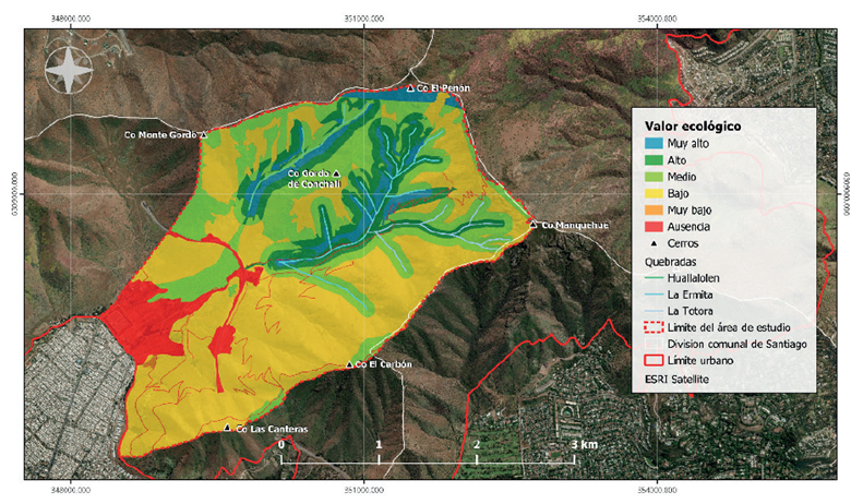 La fiabilidad de los resultados arrojados por un estudio de zonificación ecológica como el aquí presentado, dependerá en primera instancia, de la calidad de la información empleada en la etapa de inventario territorial. Esto implica contar con fuentes secundarias o primarias sobre las principales coberturas/usos de suelo a ser valoradas posteriormente, con un nivel de detalle espacial acorde a la escala cartográfica definida por la dimensión y heterogeneidad espacial del área de estudio. Por este motivo, resulta sugerible que estudios de esta índole basados en dicho catastro, puedan someterlo a verificación, como aquí se buscó hacer, o recurrir a fuentes alternativas, como el recientemente creado Plan Maestro Ambiental de la comuna de Huechuraba (DMAH, 2024). Este brinda una cartografía de clasificación de formaciones vegetales que abarca la cuenca de interés, sustentándose, de formar similar al presente estudio, en la modificación del Catastro de Uso de Suelo y Vegetación mediante interpretación visual de imágenes satelitales y trabajo en terreno. Para esto, incorporó criterios de cobertura, dominancia y fisonomía, que le confieren el suficiente detalle informativo como para emplearla en metodologías de zonificación ecológica.