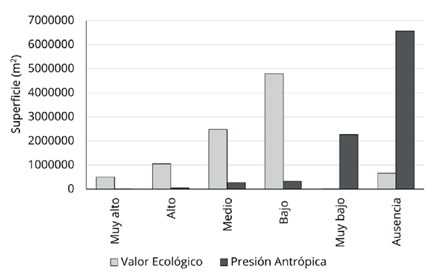 Figura 4 Superficie ocupada por las clases de Valor Ecológico y Presión Antrópica del área de estudio.