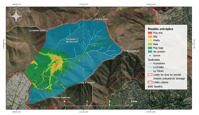 El 70% del área de estudio (6.500.270 m2) se encuentra fuera de su área de influencia de las quebradas (> 200 m), por lo que no tuvieron puntuación (0). Las puntuaciones asignadas al resto del área según distanciamiento a quebradas fueron: muy baja (1) para los anillos más externos del sistema de quebradas; baja (2) para los externos, aunque centrales, en los drenes de orden 1; moderada (3) para aquellos menos marginales y centrales en el caso de los drenes de orden 2; alta (4) para aquellos centrales de los drenes de orden 3 (incluidas las quebradas Huallalolén y La Totora) y muy alta (5) para el anillo central de la Quebrada La Ermita.