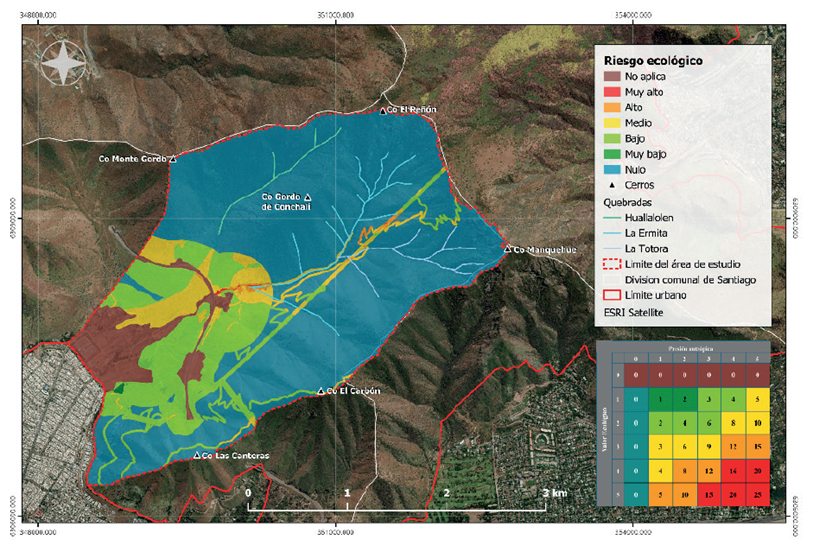 Zonificación ecológica: las clasificaciones de Valor Ecológico y Presión Antrópica posibilitaron subsecuentemente, la determinación del Riesgo Ecológico, entendido como un diagnóstico del territorio que representa la posibilidad de ocurrencia de algún efecto nocivo sobre el ecosistema, siendo las actividades antrópicas la causa del riesgo, y el ecosistema el objeto de afectación (Universidad de Chile, 2002; MMA & ONU, 2021). Para esto, ambas clasificaciones fueron ingresadas a una matriz de doble entrada, situando en la columna el Valor Ecológico y en la fila la Presión Antrópica, de modo tal que, a mayor valor de ambas para un área dada, mayor valor de la clase de Riesgo Ecológico y viceversa. Así, se obtuvieron seis clases de Riesgo Ecológico: “muy alto” (5), “alto” (4), “medio” (3), “bajo” (3), “muy bajo” (1) y “nulo” (0), descartándose polígonos ocupados por actividades antrópicas o suelos desnudos, intrínsecamente carentes de Valor Ecológico (no aplica).
