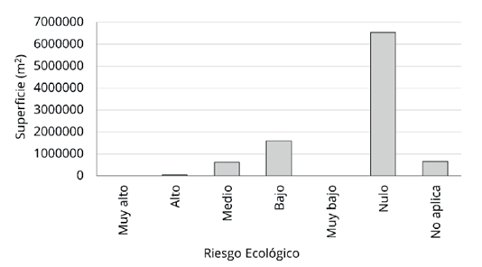 Las Figura 6 y Figura 7 muestran la distribución espacial y superficie ocupada por las clases de Riesgo Ecológico, respectivamente, resultantes del cruce de clases de Valor Ecológico y Presión Antrópica. El mayor Riesgo Ecológico se concentró en torno a la sección baja de la cuenca, donde se observa la predominancia de las clases “medio” y “bajo” (622.288 y 1.592.258 m2, respectivamente). Las clases de Riesgo Ecológico “alto” y “muy alto” en tanto (43.929 y 5.672 m2, respectivamente), se remitieron a puntos muy acotadas del área de estudio, asociados a la autopista, senderos y asentamientos poblados.