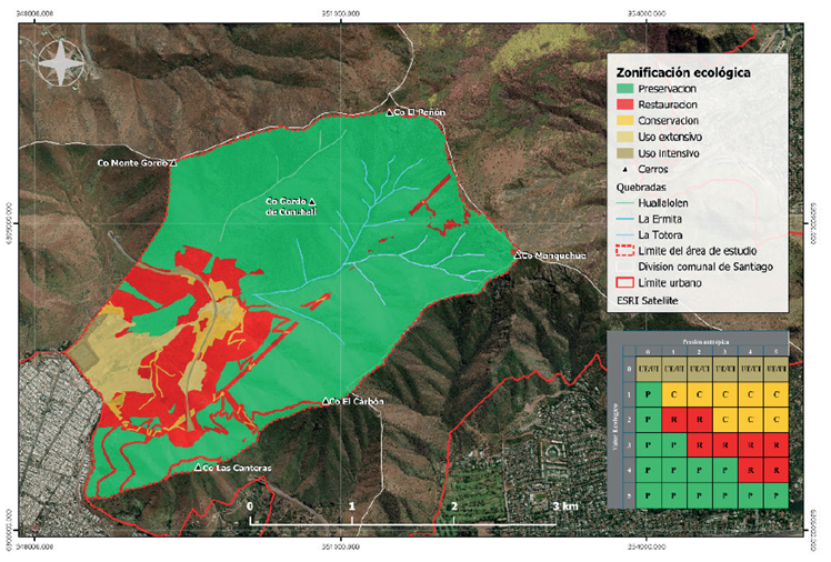 El presente estudio plantea una propuesta de zonificación ecológica de escala local para la cuenca de los cerros Manquehue-El Peñón, que pese al marco regulatorio que la rige, se encuentra propensa a la agudización de perturbaciones derivadas de la expansión urbana, requiriendo, por lo tanto, una evaluación integrada de sus atributos de biodiversidad y presiones antrópicas. La propuesta se articula en base a tres objetivos específicos secuenciales, comenzando por la 1) caracterización de las principales coberturas de suelo del área de estudio, para luego, 2) estimar su valor ecológico y presión antrópica y con ello; 3) determinar riesgos ecológicos de lo que se desprendan acciones de manejo, esperando con esto contribuir a su planificación y gestión ambientalmente sustentable.