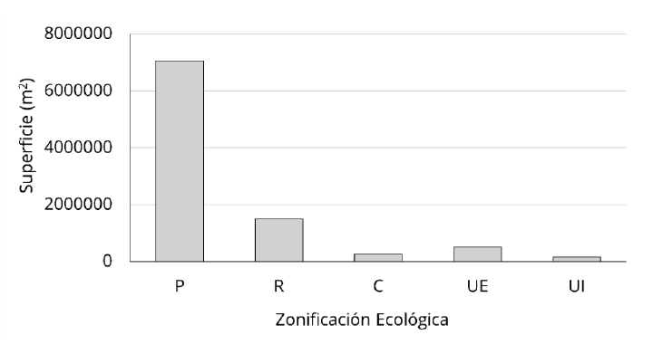 Finalmente, las Figura 8 y Figura 9 presentan la distribución espacial y superficie ocupada por las clases de zonificación ecológica, respectivamente, resultantes del cruce de clases de Valor Ecológico y Presión Antrópica. La clase “preservación” fue la más dominante, cubriendo el 77,84% del área de estudio (7.056.653 m2) y distribuyéndose en torno a gran parte de las superficies carentes de Riesgo Ecológico. La clase “restauración”, abarcó la segunda mayor superficie del área de estudio (1.502.481 m2), quedando circunscrita a gran parte de superficies clasificadas con un Riesgo Ecológico “bajo”. Las clases restantes se localizaron de forma muy puntual en la zona baja de la cuenca, donde la totalidad de actividades antrópicas se emplazan.