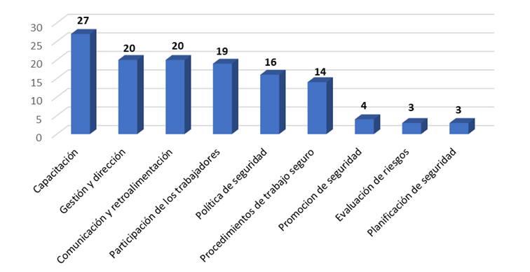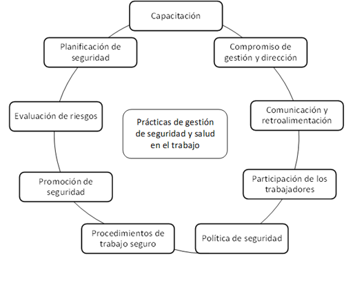 Para Ajmal et al. (2021), el compromiso de la dirección con la seguridad; las normas y los procedimientos de seguridad; y la formación en seguridad siguen siendo las prácticas de gestión de la seguridad más utilizadas para mejorar el rendimiento de la seguridad y la salud en el trabajo. Por su parte, Cheng et al. (2013) hallaron que el comité de seguridad a nivel de proyecto, la política de seguridad escrita y el esquema de capacitación en seguridad explican significativamente la variación sobre el desempeño de los proyectos de construcción. Por otro lado, Sorensen et al. (2018) identificaron el compromiso de liderazgo; la participación; las políticas, los programas y las prácticas que fomentan condiciones de trabajo favorables; las estrategias integrales y colaborativas; el cumplimiento de las reglamentaciones y normas éticas federales y estatales; y el cambio basado en datos, como prácticas fundamentales para proteger y promover la seguridad, la salud y el bienestar de los trabajadores, mientras que, Latif et al. (2021) confirmaron que las prácticas de gestión de seguridad y el comportamiento de seguridad previenen accidentes y lesiones en actividades al aire libre.