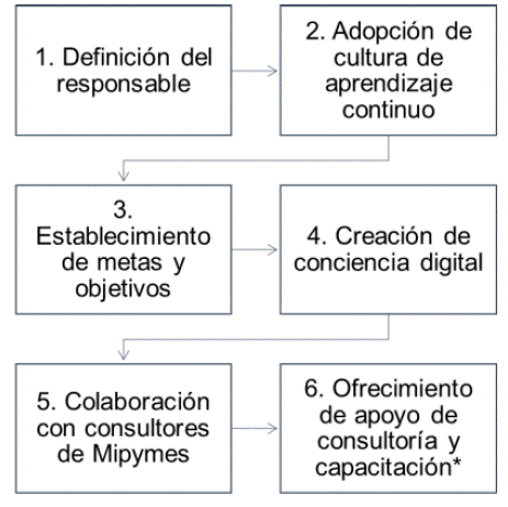 La propuesta de integración de procesos digitales en las Mipymes supone un desafío mayor, ya que no se cuenta con la misma infraestructura ni capital financiero o humano en comparación con las empresas grandes (González, 2021). Por lo tanto, para iniciar un proceso de transformación digital en las mipymes, se necesita establecer un plan de acción en el cual, se evalúen las necesidades y se generen estrategias para mejorar la eficiencia de los procesos productivos y administrativos de las organizaciones (Armas, 2019; Schallmo & Williams, 2018). Ulas (2019)), propuso un proceso de seis fases (detalladas en la Figura 1) para integrar la transformación digital en Mipymes.