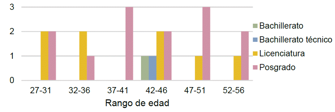 Para el análisis descriptivo de los datos demográficos de las empresarias, se agruparon los datos utilizando la Regla de Sturges (K=1+ 𝐿𝑜𝑔 2 𝑁 ) (Sturges, 1926). En primer lugar, se organizó la información en función de la edad de las empresarias, obteniéndose 6 intervalos de 5 años cada uno. En relación con el nivel educativo, los resultados, representados en la Figura 2, indican que el grupo etario más numeroso (27.3%) se sitúa entre los 42 y 46 años. Además, se observa que el 59.1% de la muestra cuenta con estudios de posgrado, siendo este el nivel académico más recurrente entre las encuestadas, de igual forma, la especialidad empresarial, fue seleccionada por el 47.4% de las encuestadas, siendo esta la respuesta más común.