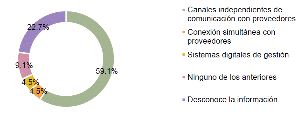 Si bien la integración de canales de venta digitales se presenta como una herramienta hacia la transformación digital de las empresas, Sebastian et al. (2017)) indican que otra de las estrategias es la integración de tecnologías digitales para gestión empresarial. De acuerdo con las respuestas presentadas en la Figura 3 indican que principal medio de comunicación con los proveedores, son canales independientes, en comparativa, se encuentran la conexión simultánea con proveedores y los sistemas digitales de gestión empresarial con una diferencia porcentual de 54.5% cada uno, es importante resaltar que, el 27.7% de las empresarias desconoce esta información.