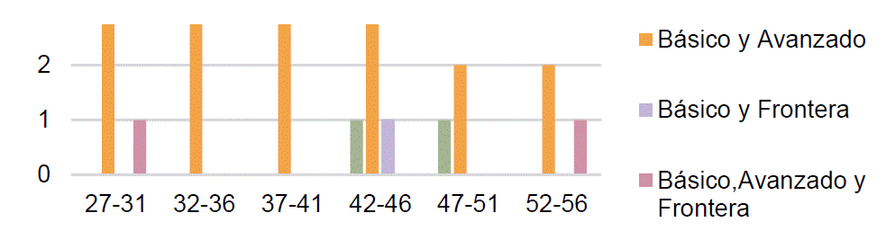 En primer lugar, se realizó una comparación entre las modalidades de uso de las tecnologías y las edades de las empresarias. Los resultados presentados en la Figura 5 revelan que el rango de edad con mayor adopción tecnológica corresponde a las empresarias de entre 40 y 46 años. Este grupo etario destaca por su capacidad para integrar tecnologías de los tres niveles, lo que sugiere una mayor disposición a adoptar herramientas diversas.