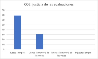 Aunque en ambos grupos hay una percepción favorable en la justicia de las evaluaciones, la relación fue inversa. La mayoría de los alumnos de Comunicación Escrita (69%) percibieron las evaluaciones como “Justas siempre”; mientras que la mayoría de los alumnos de Argumentación (57%) las percibieron como “Justas la mayoría de las ocasiones”. El resultado es interesante puesto que en ambos grupos se usaron casi las mismas estrategias (evaluación del docente, evaluación por pares). La única diferencia es que la evaluación de pares en Argumentación era grupal (todo el grupo evaluaba), mientras que la evaluación de pares en Comu Comunicación Escrita era individual (el trabajo era evaluado por 3 compañeros).