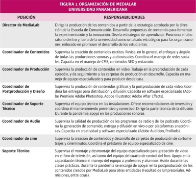 Para lograr lo previo, el laboratorio está organizado como un medio de comunicación (Figura 1) con coordinadores - profesores de área que fungen como administradores de actividades (Glassner, 2019) y editores de contenido; pero que también tiene un rol docente y de instrucción con los participantes. Además, la mayoría tiene un encargo como profesor dentro de alguna jefatura académica dentro de la Escuela de Comunicación.