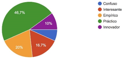 Respecto al modelo de aprendizaje, la opción más seleccionada fue práctico, seguida por empírico. La gráfica 1 muestra las demás opciones disponibles. Para responder si los alumnos aprenden por ellos mismos, luego de explicarles el concepto de auto determinación, el 97% respondió que consideran que el modelo de MediaLab sí es auto determinado por ellos.