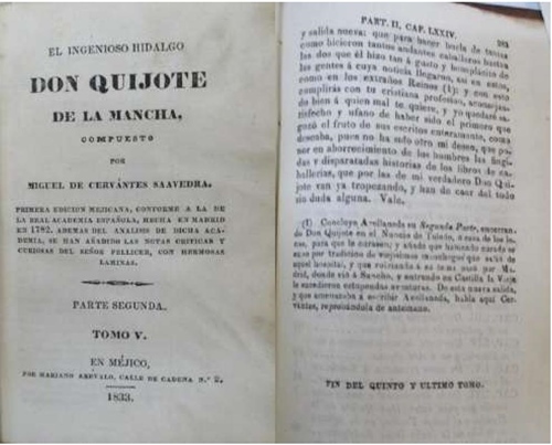 El ingenioso hidalgo Don Quijote de la Mancha. M. de Cervantes Saavedra Primera edición en México, 1833, 5 vols. Sin colofó