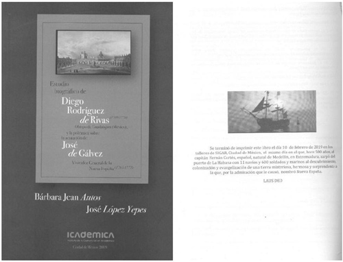 El colofón dice: “Se terminó de imprimir este libro el día 10 de febrero de 2019 en los talleres SIGAR, Ciudad de México, el mismo día en el que hace 500 años, el capitán Hernán Cortés, español natural de Medellín, en Extremadura, zarpó del puerto de La Habana con 11 navíos y 600 soldados y marinos al descubrimiento, colonización y evangelización de una tierra misteriosa, hermosa y sorprendente a la que, por la admiración que le causó, le nombró Nueva España. LAUS DEI