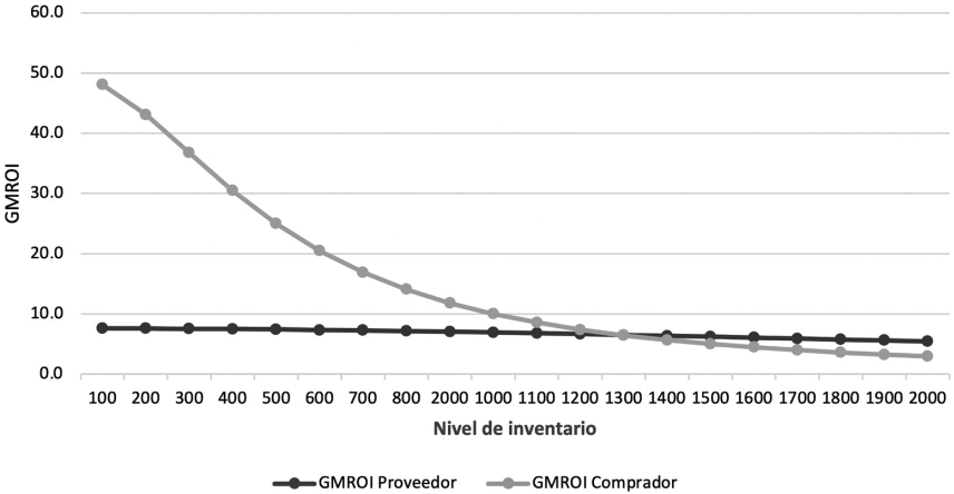 En la Gráfica 4, puede observarse el resultado de dicho análisis. En el valor de GMROI para el proveedor no se tienen grandes variaciones a los distintos valores de inventario, mientras que en el nivel de GMROI para el comprador se observa que a menor inventario se tiene una mayor rentabilidad de este y, al aumentar el inventario, el valor de GMROI disminuye. Un punto más a observar es que en el valor de 1300 piezas de inventario, tanto para el proveedor como para el comprador, el valor de GMROI es el mismo (ver Gráfica 4).
