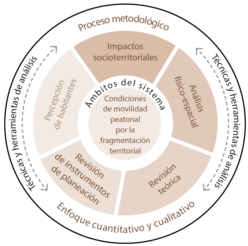 Este trabajo se abordó con una metodología basada en dos enfoques complementarios en el proceso de investigación. Para comprender los problemas desde su origen, las causas y afectaciones, y precisar las consecuencias de las diferentes problemáticas territoriales, el tema se abordó con el enfoque de los sistemas complejos propuesto por García (2006), lo que ayudó a analizar los problemas de manera crítica y comprender su interrelación con las diversas causas que afectaron la movilidad y dieron origen a la fragmentación socioterritorial, así como las situaciones del entorno que incidieron en el problema central. Aunado a lo anterior, para el análisis de datos cuantitativos e inferir los resultados recabados se utilizó la metodología de Hernández, Fernández y Baptista (2014).