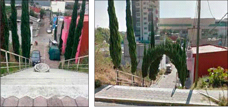 Fotos 3, 4 Acceso a una calle de San Miguel La Rosa por una escalinata con pendiente pronunciada. Fotos de dos años distintos: 2015 y 2021.