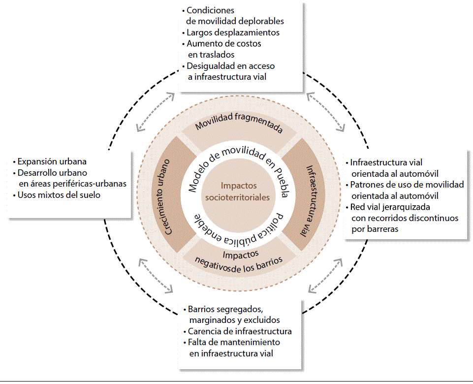 La Figura 2 muestra los principales impactos socioterritoriales derivados de una política gubernamental caracterizada por un protagonismo político que causó graves problemas mediante la expansión urbana, pues se construyó infraestructura con grandes desigualdades y patrones de una movilidad orientada al automóvil, lo cual afectó la «condición de accesibilidad y movilidad de grupos sociales desfavorecidos -la mayor parte de la población- a quienes no se les ha dado respuesta a sus necesidades, sino por el contrario, se les ha condicionado una movilidad de exclusión» (Gutiérrez, 2019: 117). Por consiguiente, se puede afirmar que este nuevo modelo de movilidad de la ciudad de Puebla no tomó en cuenta la de los habitantes del barrio de San Miguel La Rosa y los limitó a vivir en un espacio en condiciones de movilidad precaria y sin intervenciones urbanas, lo que contrasta con las grandes obras de su contexto inmediato.