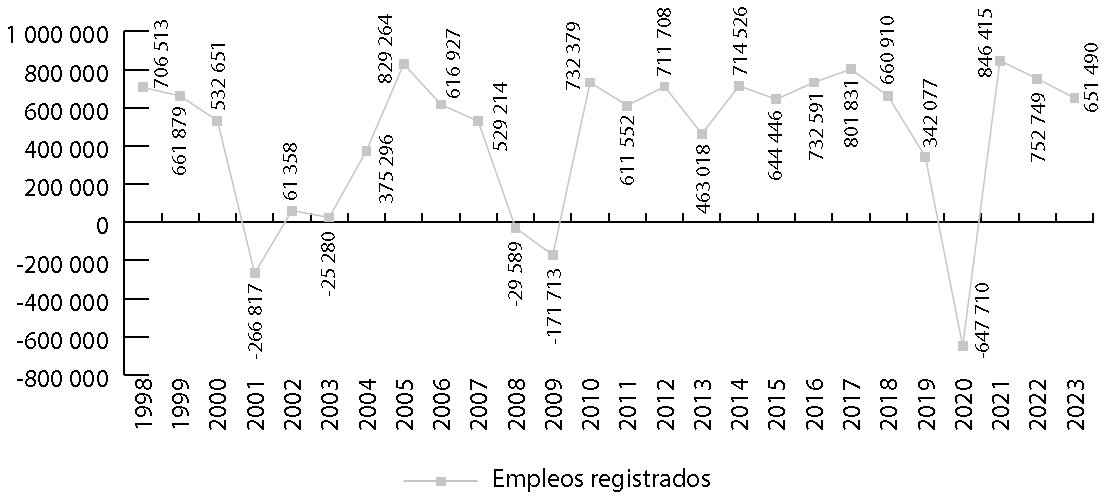 De acuerdo con lo señalado al inicio de este documento, el empleo formal perdido en 2020 se recuperó en 2021, año en que se registra mayor cantidad de empleos formales en el IMSS, para superar el nivel prepandémico de 2019 y alcanzar por primera vez los 22 millones en 2023 (véanse Gráficas 1 y 2). De esta forma, se retoma la trayectoria de crecimiento previa.