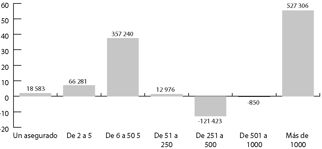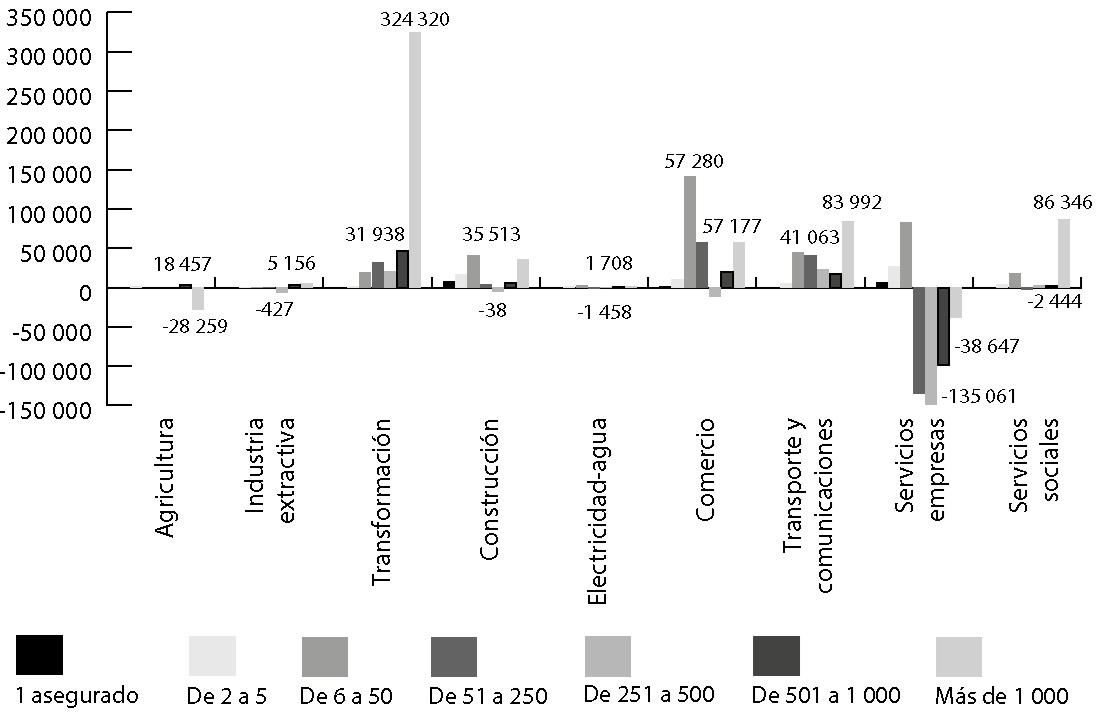 El sector de actividad en el que se concentró el cierre de los empleos a partir de los establecimientos de 51 trabajadores en adelante fue el de servicios a empresas, personas y el hogar. La creación de empleo en las de más de mil trabajadores, mientras tanto, se había «disparado» en la industria de la transformación (324 320), y había tenido buen desempeño en los servicios sociales y comunales (86 343) y en transporte y comunicaciones (83 992), seguido del comercio (57 177) y la construcción (35 513) (Gráfica 10).