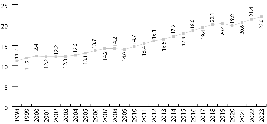 En relación con ello destaca, primeramente, el crecimiento del PIB en términos reales2 de los años 2022 (3.7%) y 2023 (3.3%), que siguieron al rebote de 6.0% de 2021, pero que en prácticamente todas las estimaciones, salvo las oficiales, se esperaba muy por debajo de estos números. En segundo lugar, resalta la relativamente rápida recuperación de los empleos formales perdidos en 2020, de modo que los 20.6 millones de plazas registradas en el IMSS en febrero de ese año, justo antes de declararse la pandemia en marzo, se volvieron a alcanzar en octubre de 2021 con 20 millones 767 000, con lo que al mismo tiempo se superó la cifra más alta registrada previamente en octubre de 2019 (de 20 millones 727 000).3 En 2021 se creó la mayor cantidad de empleos formales en un año (846 415) desde que se lleva registro, y en septiembre de 2023 se alcanzaron por primera vez los 22 millones de empleos.