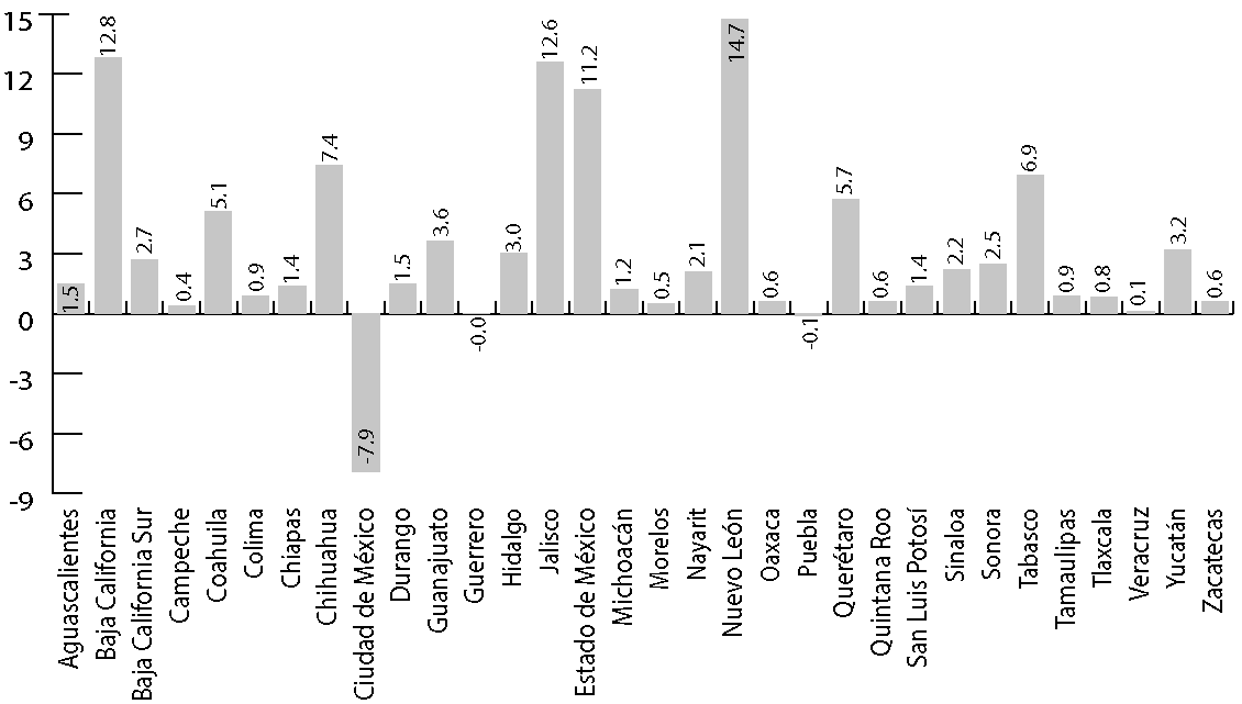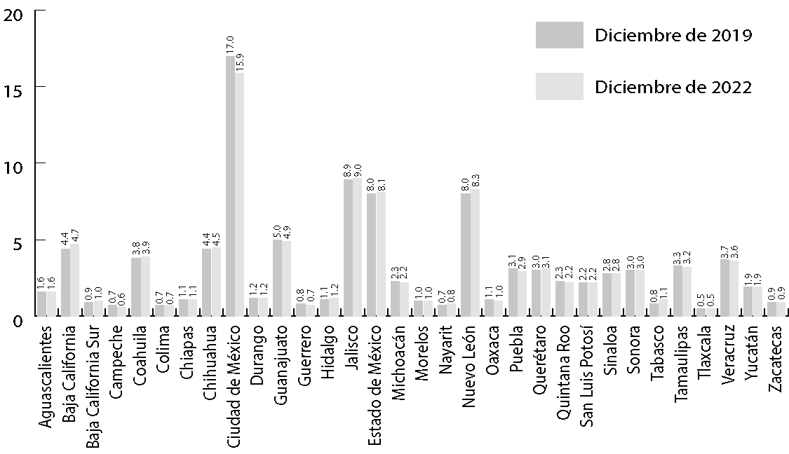 Entre los cambios porcentuales ocurridos en la participación de cada estado entre 2019 y 2022 destaca, desde luego, la pérdida de 1.1 unidades de la Ciudad de México. En sentido opuesto sobresale la ganancia de tres décimas porcentuales en cada caso de Tabasco, Nuevo León y Baja California. Sólo Puebla varió dos décimas hacia abajo; los demás estados se mantuvieron sin cambios o con sólo una décima porcentual de variación (Gráfica 4).