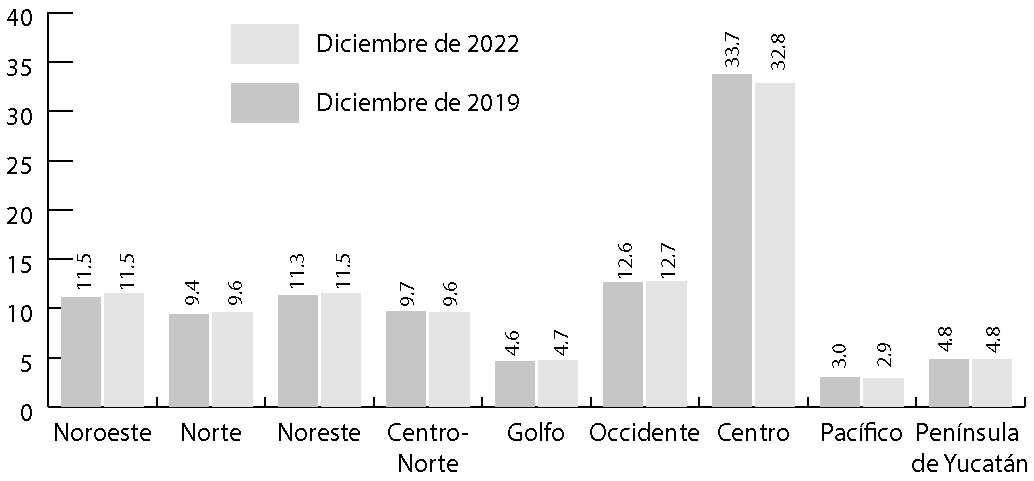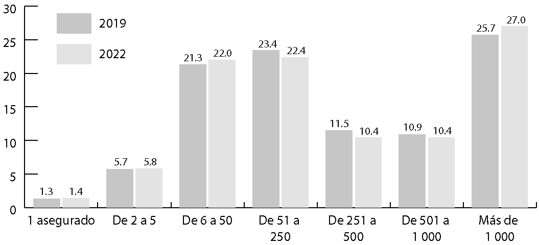 Gráfica 9 Porcentaje del empleo formal por tamaño de unidad económica, diciembre de 2019/diciembre de 2022 (porcentajes)