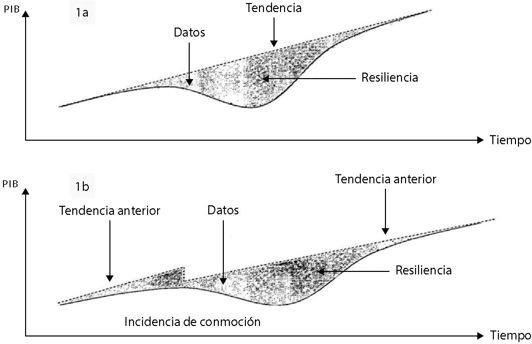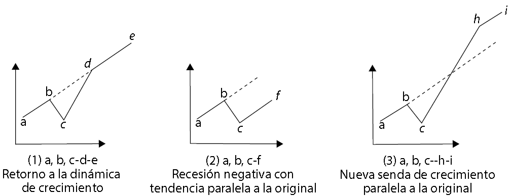 Figura 1 Representación de la resiliencia con base en la tendencia precrisis y la probable evolución postcrisis
