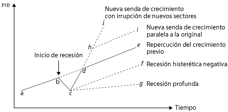 Una esquematización con bastante aceptación es la que representa distintas posibles trayectorias de una recuperación postrecesión. Martin y Gardiner (2019) recoge las aportaciones de Fingleton et al. (2012) (véase Figura 2). De acuerdo con ésta, a una situación precrisis (puntos a, b) le pueden seguir los siguientes trayectos: 1) a, b, c-d-e, si una economía retoma su tasa de crecimiento previa; 2) a, b, c-f -o recesión histerética negativa- si su comportamiento es paralelo al original, pero por debajo del mismo; 3) a, b, c-g si la recesión es muy profunda y ha destruido la base productiva económica, de manera que sigue una nueva senda a la baja y le puede llevar mucho tiempo recuperarse; 4) a, b, c- d-h-i si sucede una recuperación rápida y luego se establece una nueva senda de crecimiento paralela a la tendencia original, debido a la ocurrencia de un proceso de destrucción creativa, y 5) a, b, c, d-h-j cuando se produce una nueva senda de crecimiento, mayor que la original, en el caso de que la economía da lugar a la aparición de sectores nuevos o basados en nuevas tecnologías con alto impacto transformador.