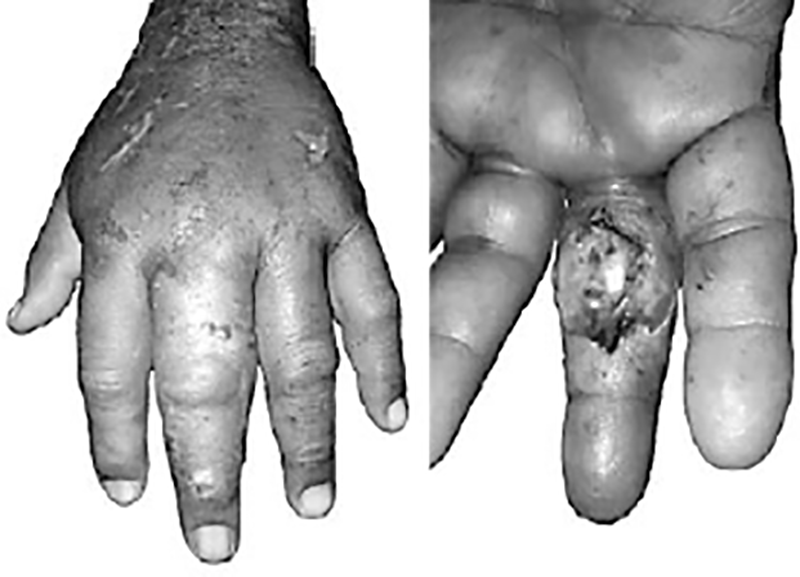 A la exploración física, se encontró ulceración con salida de secreción purulenta y necrosis distal de la tercera falange izquierda, exposición del tendón y edema hasta la palma de la mano (Fig. 1).
