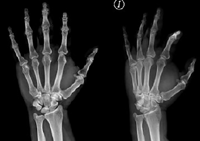 Un paciente de sexo masculino de 55 años, obrero, acudió al servicio de urgencias de un hospital del noreste de México (Hospital Universitario José Eleuterio González) por presentar una herida ulcerada con edema y secreción purulenta en la mano izquierda. Su padecimiento inició dos semanas previas, tras sufrir una herida cortante menor a 5 mm en la porción distal de la tercera falange de la mano izquierda con escaso sangrado debido a traumatismo por una caída. Posteriormente se agregó edema y dolor punzante 2/10 en la escala del dolor sin irradiación que se exacerbaba con la movilización de la articulación, sin atenuantes y se acompañaba de salida de secreción purulenta y mal oliente a través de la herida. El paciente fue valorado por un médico general de manera externa, quien realizó curaciones de la herida e indicó uso de penicilina a dosis no especificada, intramuscular durante cinco días, sin mejoría. Se agregó dificultad para movilizar la falange, hiperemia e hipertermia local por lo cual acude a nuestra institución.