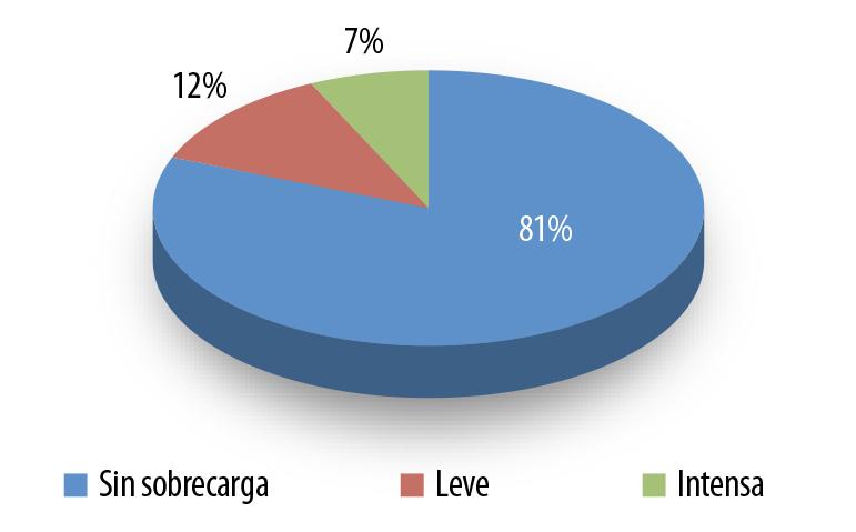 Se observó una prevalencia del 19% de sobrecarga en los cuidadores primarios dentro del conjunto total de la población encuestada, siendo predominante la categoría de sin sobrecarga (Fig. 1).