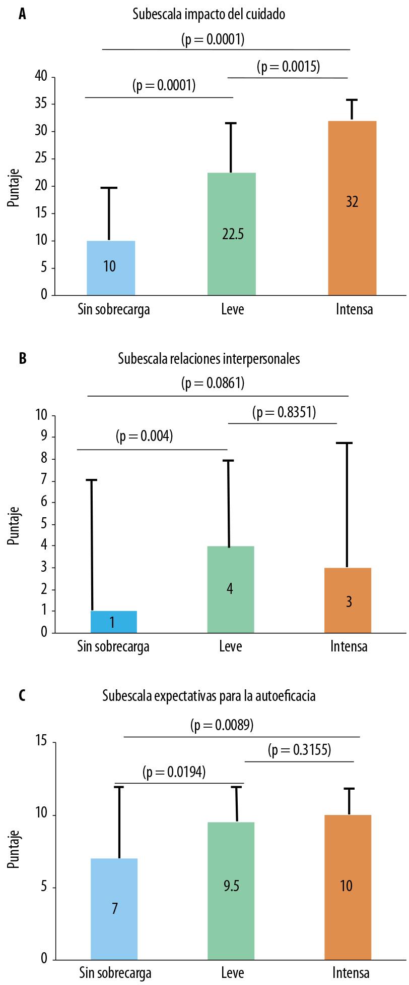 Se realizó la comparación del valor de la mediana por cada subescala (impacto del cuidado, relación interpersonal y expectativas para la autoeficacia) de acuerdo con la categoría de sobrecarga (sin sobrecarga, sobrecarga leve y sobrecarga intensa) obtenida por la escala de carga del cuidador Zarit. Se observó un incremento significativo en estas tres subescalas en relación con la sobrecarga del cuidador intensa. Este hallazgo sugiere que el cuidado directo de los familiares está influyendo significativamente en la percepción de carga por parte de los cuidadores (Fig. 2).